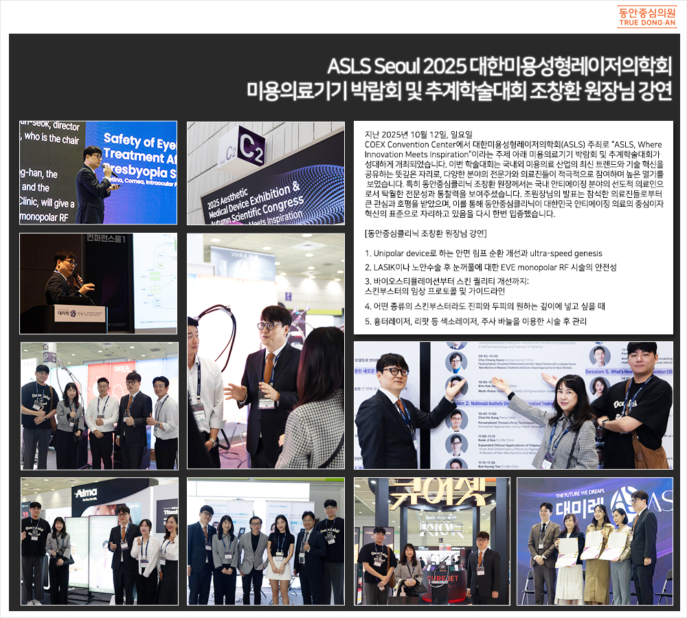 지난 2025년 10월 12일, 일요일 COEX Convention Center에서 대한미용성형레이저의학회(ASLS) 주최로 “ASLS, Where Innovation Meets Inspiration”이라는 주제 아래 미용의료기기 박람회 및 추계학술대회가 성대하게 개최되었습니다. 이번 학술대회는 국내외 미용의료 산업의 최신 트렌드와 기술 혁신을 공유하는 뜻깊은 자리로, 다양한 분야의 전문가와 의료진들이 적극적으로 참여하며 높은 열기를 보였습니다. 특히 동안중심클리닉 조창환 원장께서는 국내 안티에이징 분야의 선도적 의료인으로서 탁월한 전문성과 통찰력을 보여주셨습니다. 조원장님의 발표는 참석한 의료진들로부터 큰 관심과 호평을 받았으며, 이를 통해 동안중심클리닉이 대한민국 안티에이징 의료의 중심이자 혁신의 표준으로 자리하고 있음을 다시 한번 입증했습니다. [동안중심클리닉 조창환 원장님 강연] 1. Unipolar device로 하는 안면 림프 순환 개선과 ultra-speed genesis 2. LASIK이나 노안수술 후 눈꺼풀에 대한 EVE monopolar RF 시술의 안전성 3. 바이오스티뮬레이션부터 스킨 퀄리티 개선까지: 스킨부스터의 임상 프로토콜 및 가이드라인 4. 어떤 종류의 스킨부스터라도 진피와 두피의 원하는 깊이에 넣고 싶을 때 5. 흉터레이저, 리팟 등 색소레이저, 주사 바늘을 이용한 시술 후 관리 ![]() |