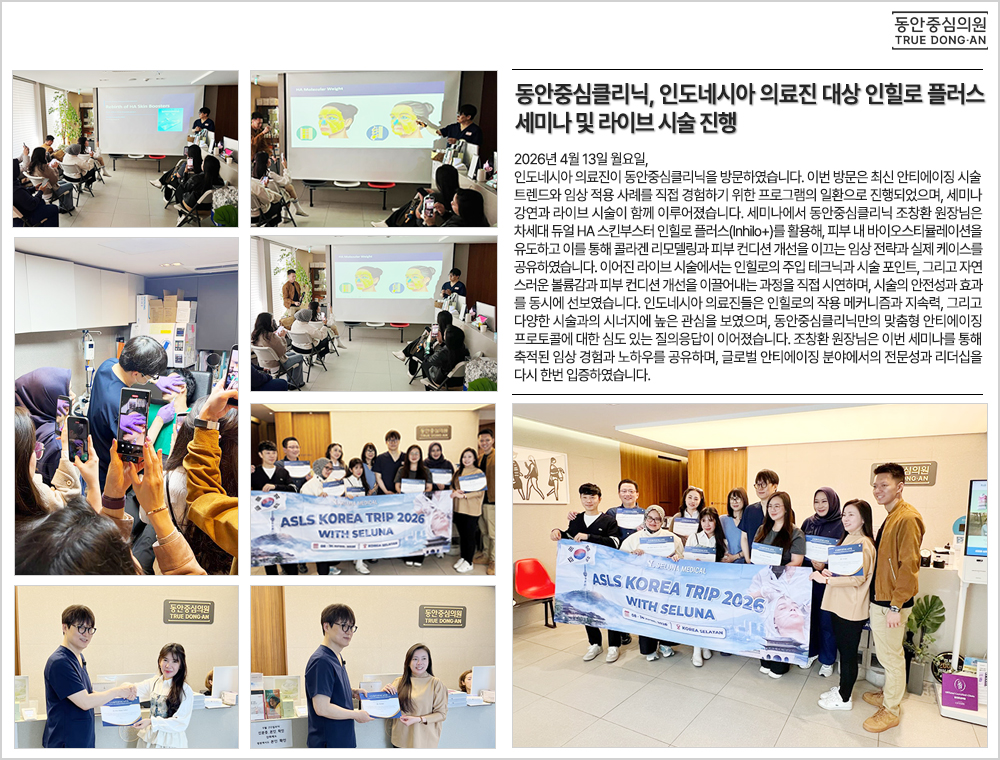 2026년 4월 13일 월요일, 인도네시아 의료진이 동안중심클리닉을 방문하였습니다. 이번 방문은 최신 안티에이징 시술 트렌드와 임상 적용 사례를 직접 경험하기 위한 프로그램의 일환으로 진행되었으며, 세미나 강연과 라이브 시술이 함께 이루어졌습니다. 세미나에서 동안중심클리닉 조창환 원장님은 차세대 듀얼 HA 스킨부스터 인힐로 플러스(Inhilo+)를 활용해, 피부 내 바이오스티뮬레이션을 유도하고 이를 통해 콜라겐 리모델링과 피부 컨디션 개선을 이끄는 임상 전략과 실제 케이스를 공유하였습니다. 이어진 라이브 시술에서는 인힐로의 주입 테크닉과 시술 포인트, 그리고 자연스러운 볼륨감과 피부 컨디션 개선을 이끌어내는 과정을 직접 시연하며, 시술의 안전성과 효과를 동시에 선보였습니다. 인도네시아 의료진들은 인힐로의 작용 메커니즘과 지속력, 그리고 다양한 시술과의 시너지에 높은 관심을 보였으며, 동안중심클리닉만의 맞춤형 안티에이징 프로토콜에 대한 심도 있는 질의응답이 이어졌습니다. 조창환 원장님은 이번 세미나를 통해 축적된 임상 경험과 노하우를 공유하며, 글로벌 안티에이징 분야에서의 전문성과 리더십을 다시 한번 입증하였습니다. ![]() |