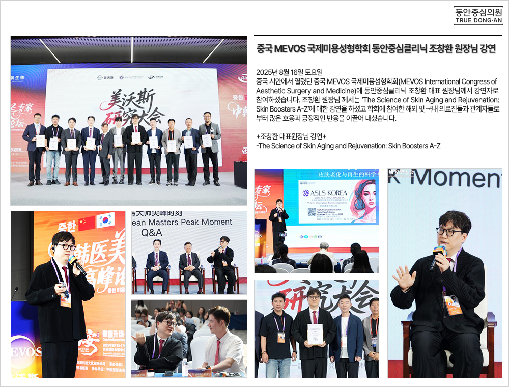 2025년 8월 16일 토요일 중국 시안에서 열렸던 중국 MEVOS 국제미용성형학회(MEVOS International Congress of Aesthetic Surgery and Medicine)에 동안중심클리닉 조창환 대표 원장님께서 강연자로 참여하셨습니다. 조창환 원장님 께서는 ‘The Science of Skin Aging and Rejuvenation: Skin Boosters A-Z’에 대한 강연을 하셨고 학회에 참여한 해외 및 국내 의료진들과 관계자들로부터 많은 호응과 긍정적인 반응을 이끌어 내셨습니다. +조창환 대표원장님 강연+ -The Science of Skin Aging and Rejuvenation: Skin Boosters A-Z ![]() |