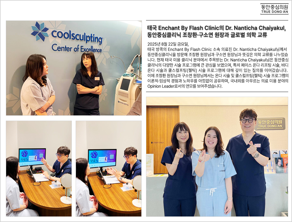 2025년 8월 22일 금요일, 태국 방콕의 Enchant By Flash Clinic 소속 의료진 Dr. Nanticha Chaiyakul님께서 동안중심클리닉을 방문해 조창환 원장님과 구소연 원장님과 뜻깊은 의학 교류를 나누었습니다. 현재 태국 미용 클리닉 분야에서 주목받는 Dr. Nanticha Chaiyakul님은 동안중심클리닉의 다양한 시술 프로그램에 큰 관심을 보였으며, 특히 페이스 온다 리프팅 시술, 바디 온다 시술과 쿨스컬프팅(젤틱) 시술 프로그램에 대해 깊이 있는 질의를 이어갔습니다. 이에 조창환 원장님과 구소연 원장님께서는 온다 시술 및 쿨스컬프팅(젤틱) 시술 프로그램의 이론적·임상적 경험과 노하우를 아낌없이 공유하며, 국내외를 아우르는 의료 미용 분야의 Opinion Leader로서의 면모를 보여주셨습니다. ![]() |
