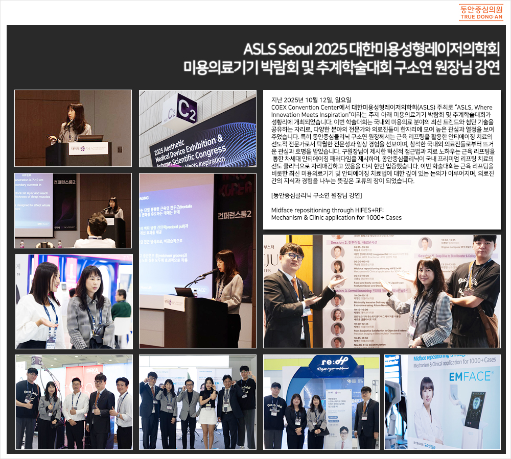 지난 2025년 10월 12일, 일요일 COEX Convention Center에서 대한미용성형레이저의학회(ASLS) 주최로 “ASLS, Where Innovation Meets Inspiration”이라는 주제 아래 미용의료기기 박람회 및 추계학술대회가 성황리에 개최되었습니다. 이번 학술대회는 국내외 미용의료 분야의 최신 트렌드와 첨단 기술을 공유하는 자리로, 다양한 분야의 전문가와 의료진들이 한자리에 모여 높은 관심과 열정을 보여주었습니다. 특히 동안중심클리닉 구소연 원장께서는 근육 리프팅을 활용한 안티에이징 치료의 선도적 전문가로서 탁월한 전문성과 임상 경험을 선보이며, 참석한 국내외 의료진들로부터 뜨거운 관심과 호평을 받았습니다. 구원장님이 제시한 혁신적 접근법과 치료 노하우는 근육 리프팅을 통한 차세대 안티에이징 패러다임을 제시하며, 동안중심클리닉이 국내 프리미엄 리프팅 치료의 선도 클리닉으로 자리매김하고 있음을 다시 한번 입증했습니다. 이번 학술대회는 근육 리프팅을 비롯한 최신 미용의료기기 및 안티에이징 치료법에 대한 깊이 있는 논의가 이루어지며, 의료진 간의 지식과 경험을 나누는 뜻깊은 교류의 장이 되었습니다. [동안중심클리닉 구소연 원장님 강연] Midface repositioning through HIFES+RF: Mechanism & Clinic application for 1000+ Cases ![]() |
