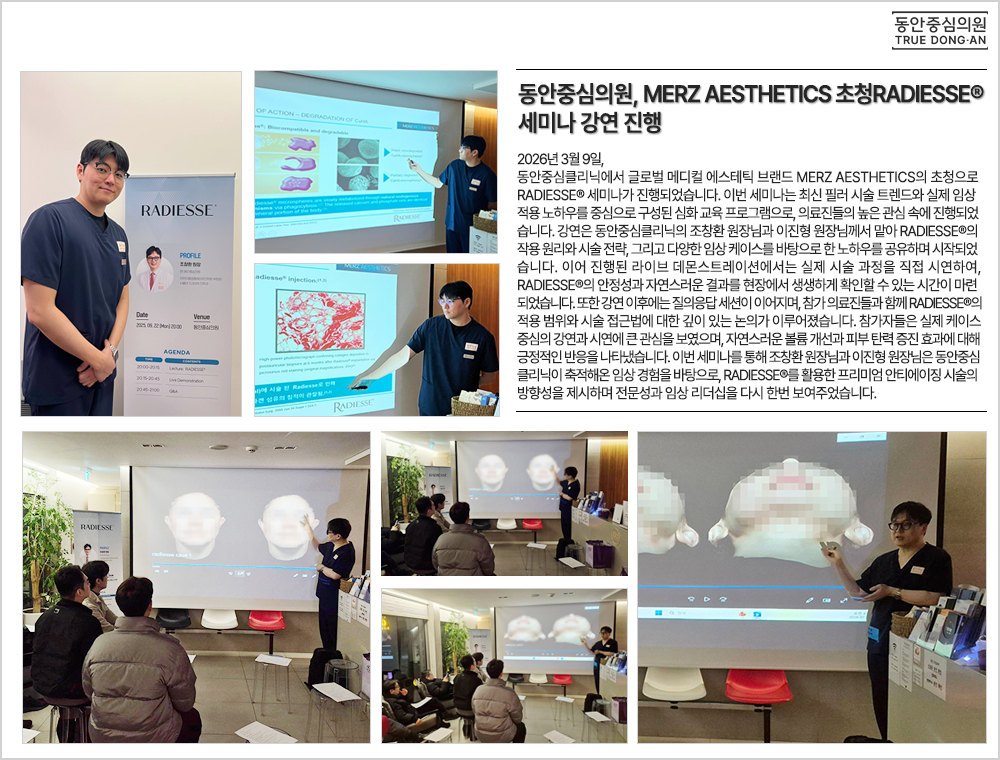 2026년 3월 9일, 동안중심클리닉에서 글로벌 메디컬 에스테틱 브랜드 MERZ AESTHETICS의 초청으로 RADIESSE® 세미나가 진행되었습니다. 이번 세미나는 최신 필러 시술 트렌드와 실제 임상 적용 노하우를 중심으로 구성된 심화 교육 프로그램으로, 의료진들의 높은 관심 속에 진행되었습니다. 강연은 동안중심클리닉의 조창환 원장님과 이진형 원장님께서 맡아 RADIESSE®의 작용 원리와 시술 전략, 그리고 다양한 임상 케이스를 바탕으로 한 노하우를 공유하며 시작되었습니다. 이어 진행된 라이브 데몬스트레이션에서는 실제 시술 과정을 직접 시연하여, RADIESSE®의 안정성과 자연스러운 결과를 현장에서 생생하게 확인할 수 있는 시간이 마련되었습니다. 또한 강연 이후에는 질의응답 세션이 이어지며, 참가 의료진들과 함께 RADIESSE®의 적용 범위와 시술 접근법에 대한 깊이 있는 논의가 이루어졌습니다. 참가자들은 실제 케이스 중심의 강연과 시연에 큰 관심을 보였으며, 자연스러운 볼륨 개선과 피부 탄력 증진 효과에 대해 긍정적인 반응을 나타냈습니다. 이번 세미나를 통해 조창환 원장님과 이진형 원장님은 동안중심클리닉이 축적해온 임상 경험을 바탕으로, RADIESSE®를 활용한 프리미엄 안티에이징 시술의 방향성을 제시하며 전문성과 임상 리더십을 다시 한번 보여주었습니다. ![]() |
