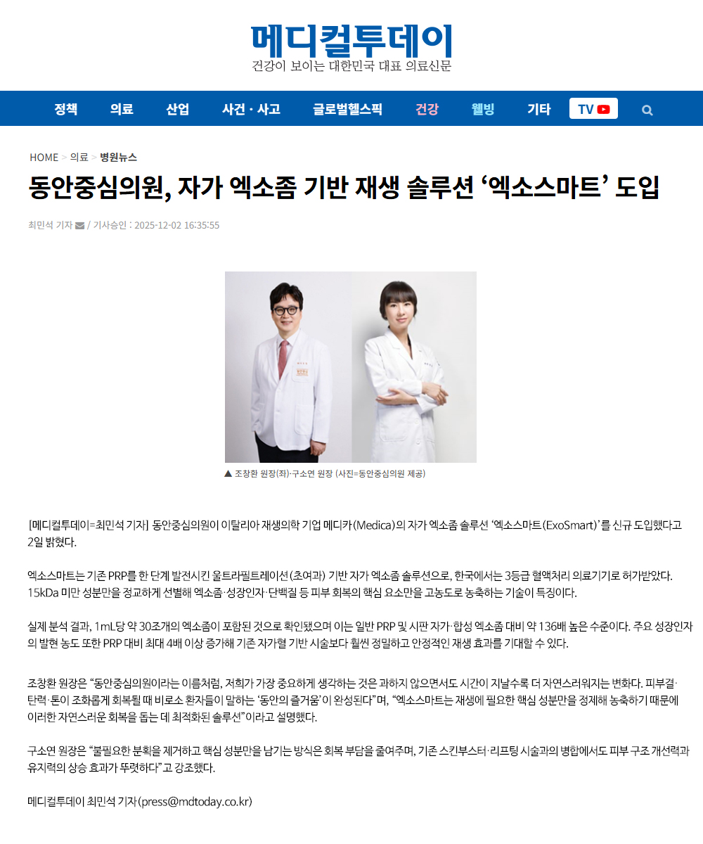 | 14 | 동안중심의원, 자가 엑소좀 기반 재생 솔루션 ‘엑소스마트’ 도입 | 2025.12.12 | 51 |