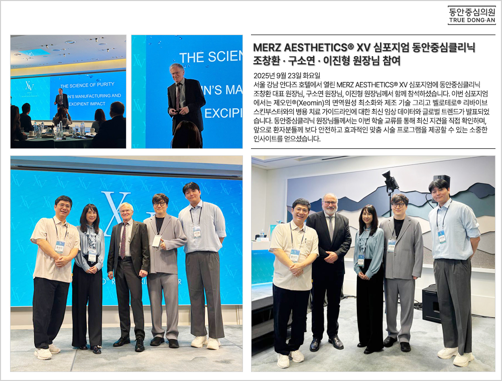 2025년 9월 23일 화요일 서울 강남 안다즈 호텔에서 열린 MERZ AESTHETICS® XV 심포지엄에 동안중심클리닉 조창환 대표 원장님, 구소연 원장님, 이진형 원장님께서 함께 참석하셨습니다. 이번 심포지엄에서는 제오민®(Xeomin)의 면역원성 최소화와 제조 기술 그리고 벨로테로® 리바이브 스킨부스터와의 병용 치료 가이드라인에 대한 최신 임상 데이터와 글로벌 트렌드가 발표되었습니다. 동안중심클리닉 원장님들께서는 이번 학술 교류를 통해 최신 지견을 직접 확인하며, 앞으로 환자분들께 보다 안전하고 효과적인 맞춤 시술 프로그램을 제공할 수 있는 소중한 인사이트를 얻으셨습니다. ![]() |